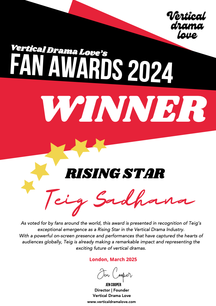 Teig was nominated for three awards in the 2024 inaugural Vertical Drama Love Awards
