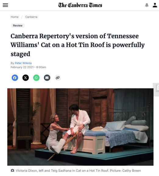 Teig received critical acclaim for his award-winning performance as Brick in Cat on a Hot Tin Roof (Canberra Repertory) and has self-produced festival recognised short films (A Lonely Harvest, Claymates).